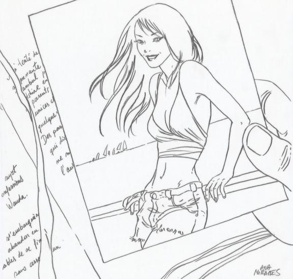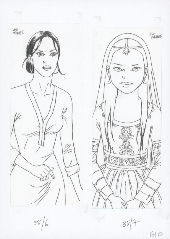 > Catalogue > Ana Miralles > Djinn > Kim Nelson > Planche originale n°38 accompagnée de ses 5 étapes préparatoires à la mine de plomb sur calque