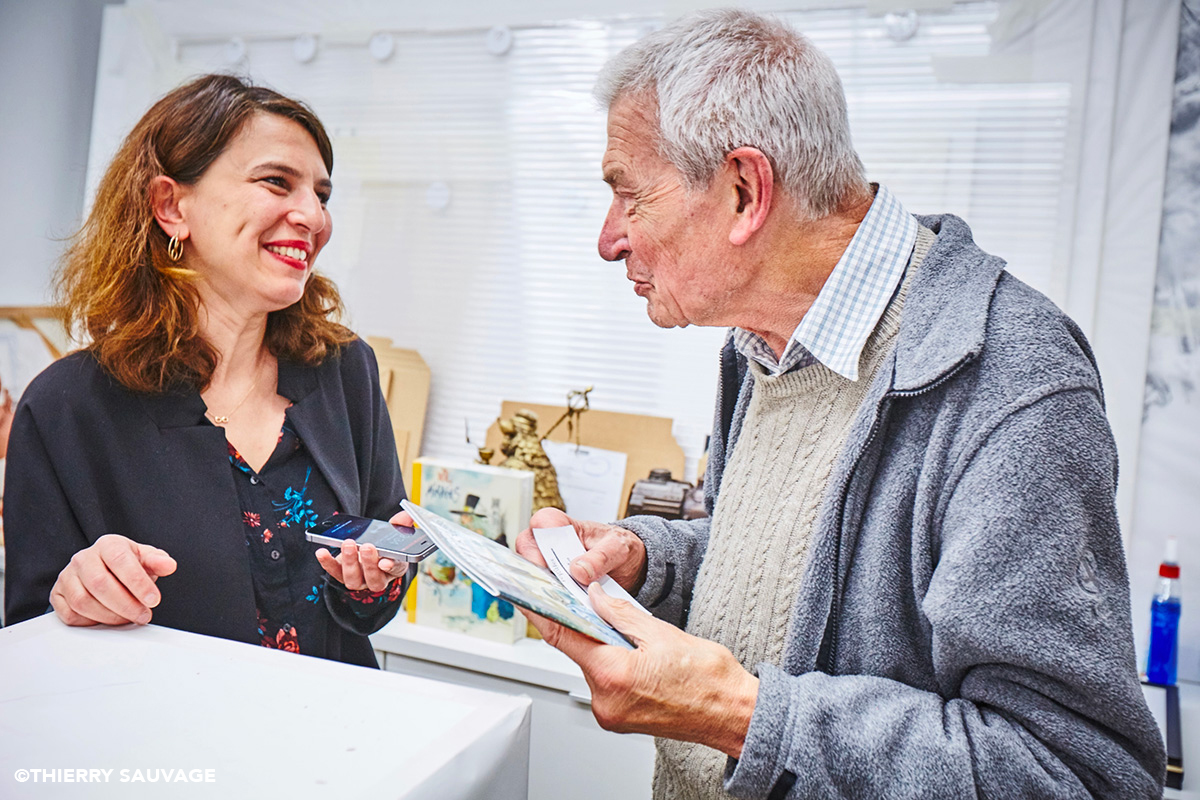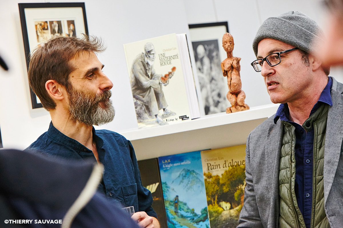 La galerie Daniel Maghen a le plaisir de consacrer également cette exposition au dessinateur et scénariste français Christian Lax, avec notamment les splendides planches au lavis d’encres noires rehaussées de touches d’aquarelle de son dernier ouvrage : Une Maternité rouge (2019, éd. Futuropolis). Plongé au cœur de l’Afrique, Lax offre un récit touchant, celui d’un jeune Malien qui partage le parcours de migrants et risque sa vie afin de sauver une sculpture précieuse, symbole et mémoire de sa culture, et de l’amener jusqu’au Louvre. Un dessin d’une rare efficacité, ponctué de paysages sublimes et de portraits poignants. Des planches issues de Un Certain Cervantès (2015, éd. Futuropolis) seront également présentées, ainsi que du Choucas (2001-2004, éd. Dupuis) et de sa trilogie historique consacrée au vélo : L'Aigle sans orteils (2005, éd. Dupuis), Pain d'alouette (2009-2011, éd. Futuropolis) et L'Écureuil du Vel'd'hiv' (2012, éd. Futuropolis).
