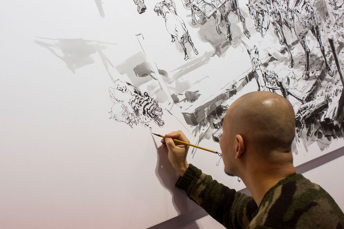 Connu pour ses drawing shows lors desquels il réalise en quelques heures des illustrations grand format, Kim Jung Gi a émergé sur la scène internationale dès 2011. Ses incroyables talents d’illustrateur lui ont très vite valu la reconnaissance des artistes du monde entier, dont Takashi Murakami qui a déjà acquis plusieurs de ses œuvres. Ses performances sont de véritables spectacles lors desquels il réalise à main levée de grandes fresques débordantes de vie.