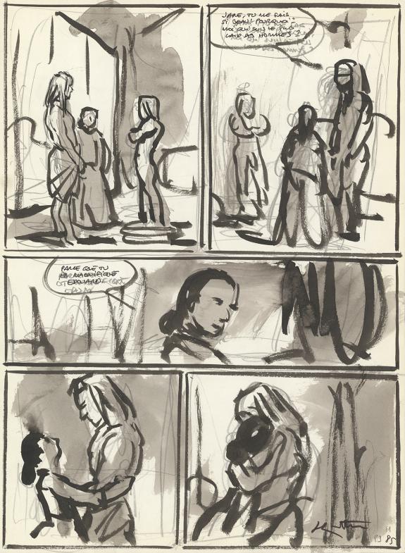 > Catalogue > Jean-Marc Rochette > Album(s) sans série > La Dernière Reine > Planche originale n°080 accompagnée de sa première étape à l'encre de Chine et au lavis