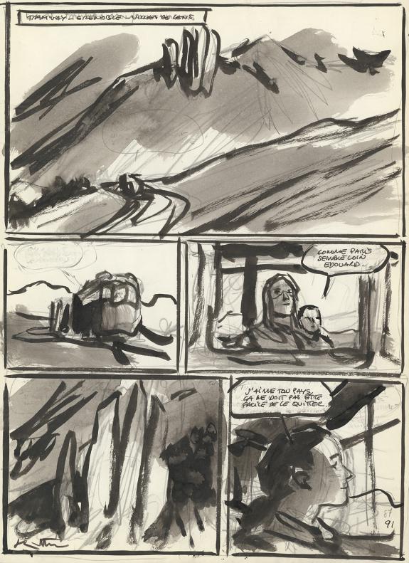 > Catalogue > Jean-Marc Rochette > Album(s) sans série > La Dernière Reine > Planche originale n°084 accompagnée de sa première étape à l'encre de Chine et au lavis