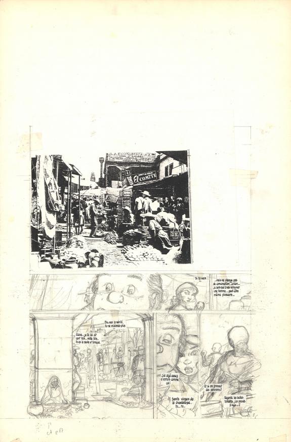 > Catalogue > Michel Plessix > Julien Boisvert > Jikuri > Planche originale n°8 accompagnée de sa planche préparatoire (aux phylactères collés) et planche préparatoire n°11 au verso