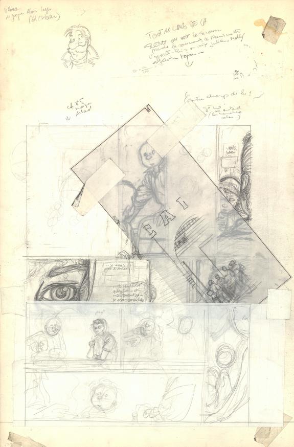 Planche originale n°8 accompagnée de sa planche préparatoire (aux phylactères collés) et planche préparatoire n°11 au verso