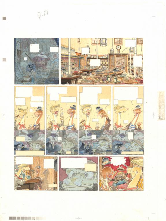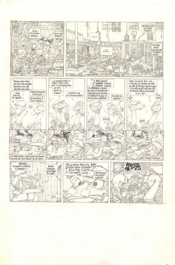> Catalogue > Michel Plessix > Le Vent dans les Saules > Foutoir au manoir > Planche originale n°112, accompagnée de sa mise en couleurs à l'aquarelle (25,5 x 32,8 cm)