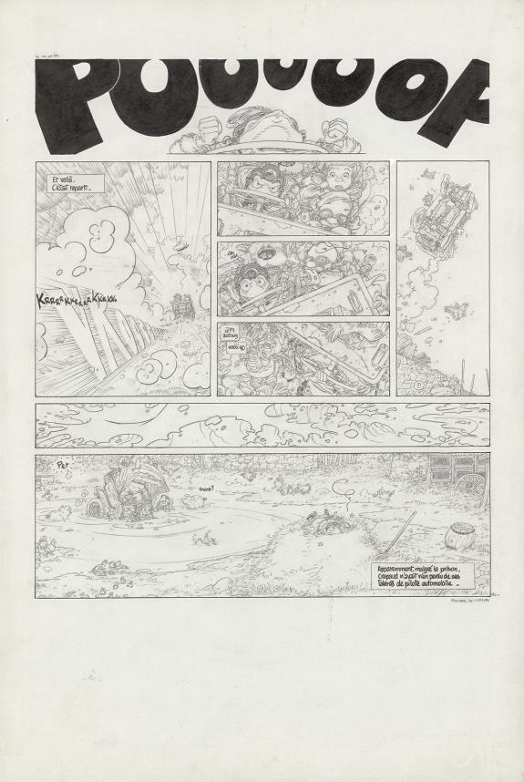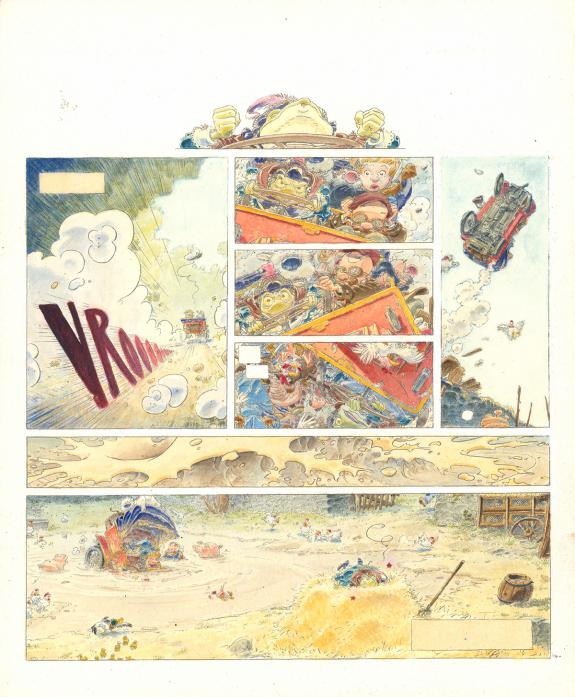 > Catalogue > Michel Plessix > Le Vent dans les Saules > Foutoir au manoir > Planche originale n°94 accompagnée de sa mise en couleurs à l'aquarelle (21,5 x 26 cm)