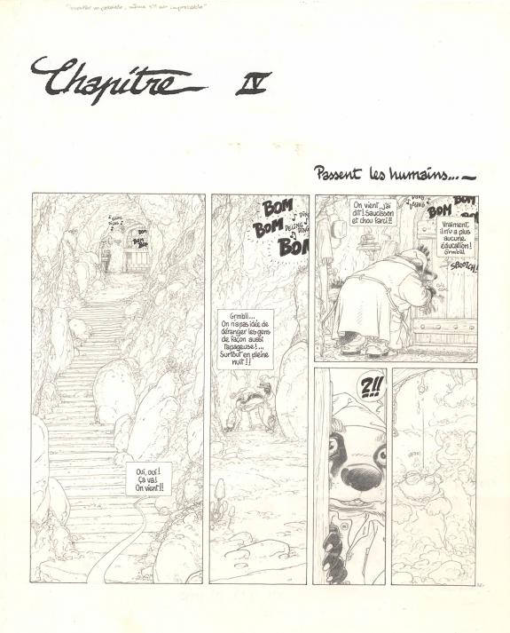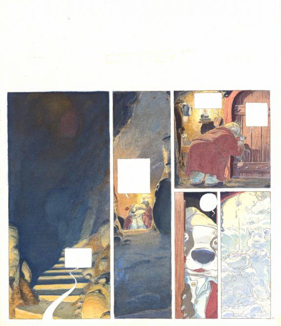 > Catalogue > Michel Plessix > Le Vent dans les Saules > Album sans titre > Planche originale n°32 accompagnée de sa mise en couleurs à l'aquarelle (26,2 x 32,1 cm)