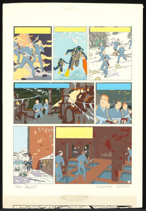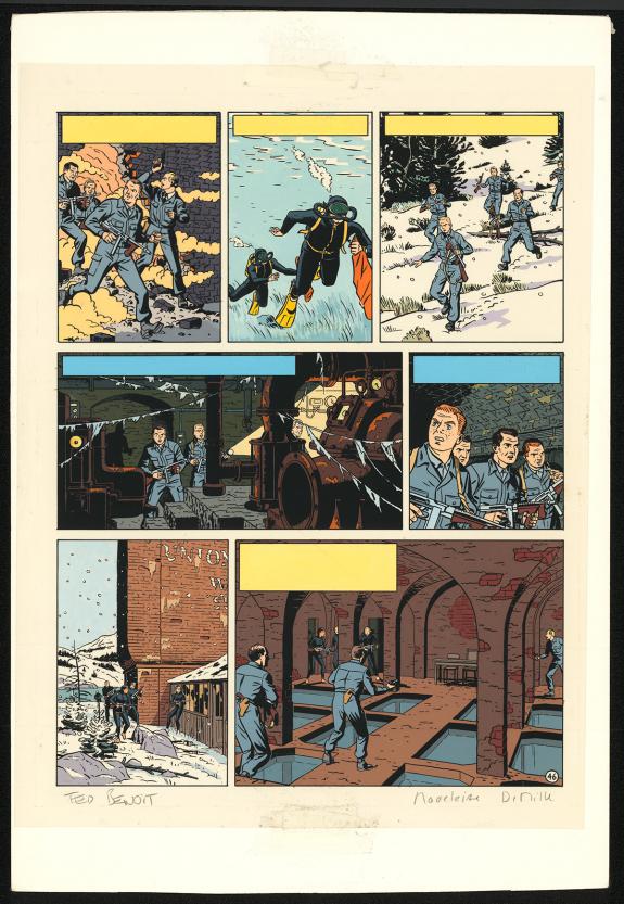 > Catalogue > Ted Benoit > Blake et Mortimer > L'Étrange Rendez-vous > Planche originale n°46 accompagnée de sa mise en couleurs à la gouache de la main de Madeleine De Mille
